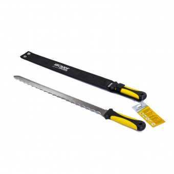 Нож для теплоизоляции Isover создан специально для резки рулонных и плитных утеплителей. Имеет длину режущей части 42 см, что позволяет разрезать скрученный рулон, что быстрее, удобнее и позволяет получить более ровный срез. Лезвие из нержавеющей стали двустороннее - с мелкими частыми зубцами с одной стороны и более крупными волнообразными с другой. Рукоятка узкая, противоскользящая, с желтыми накладками (чтобы инструмент легче было заметить на рабочем месте).
